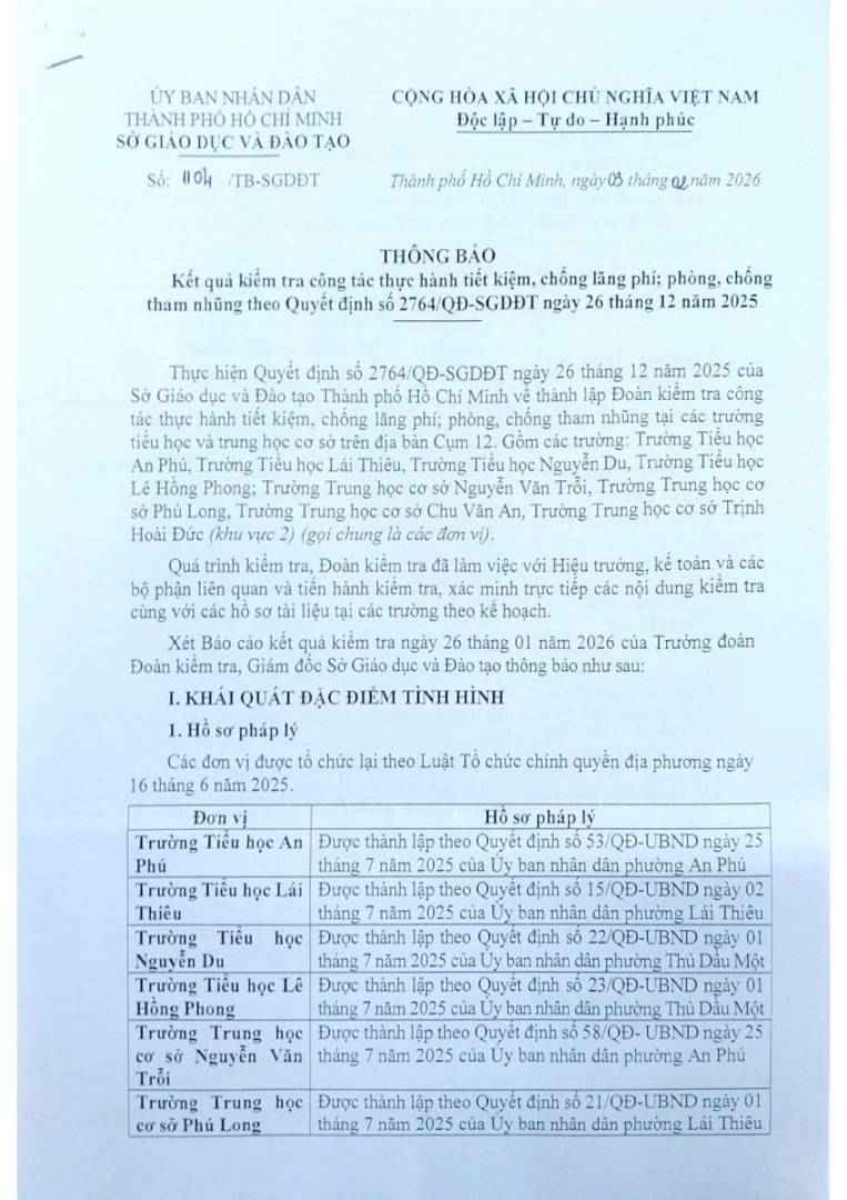 Công khai Thông báo kết quả kiểm tra công tác thực hành tiết kiệm, chống lãng phí; phòng chống tham nhũng theo Quyết định số 2764/QĐ-SGDĐT ngày 26/12/2025