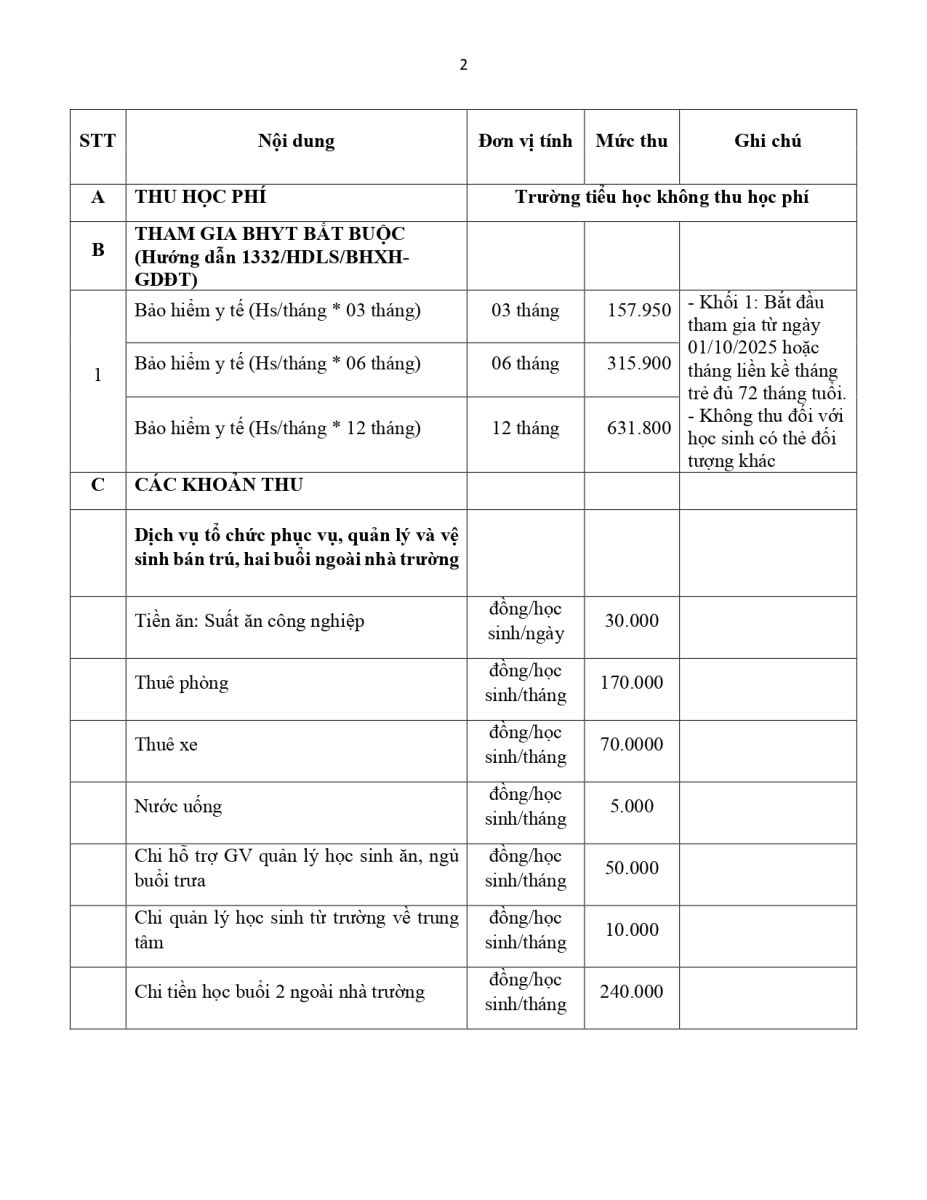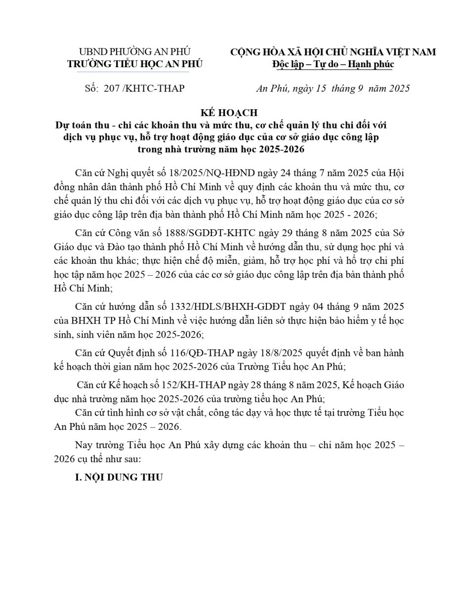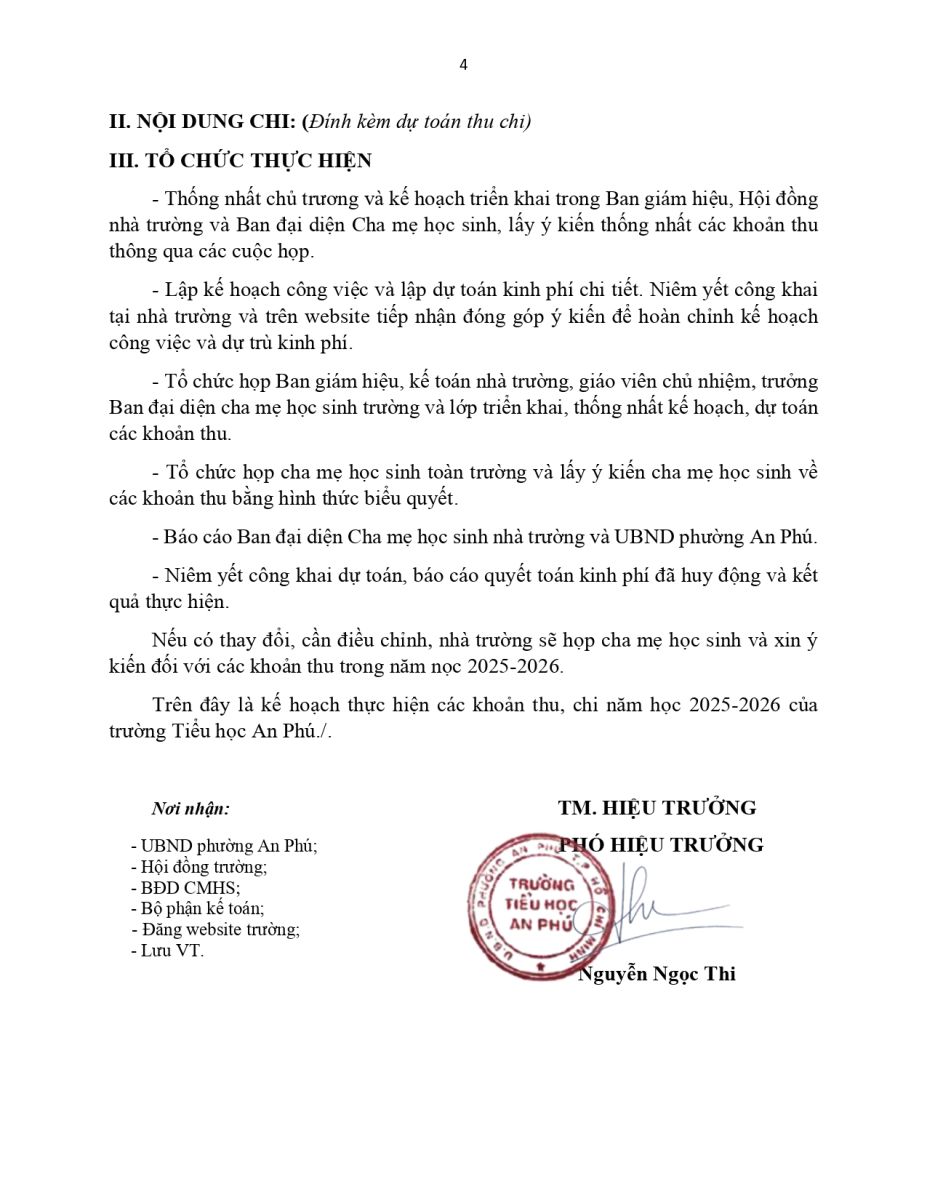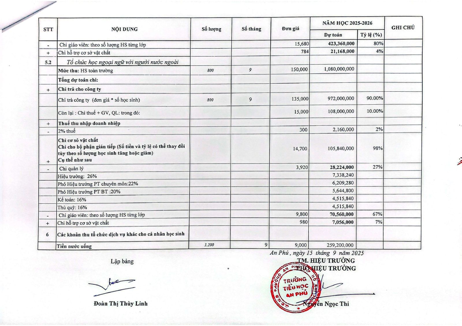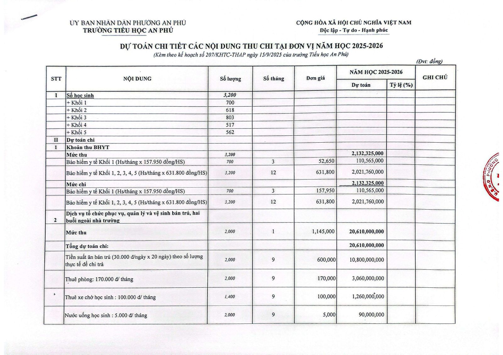 Trường Tiểu học An Phú thông báo Kế hoạch và dự toán thu – chi năm học 2025-2026