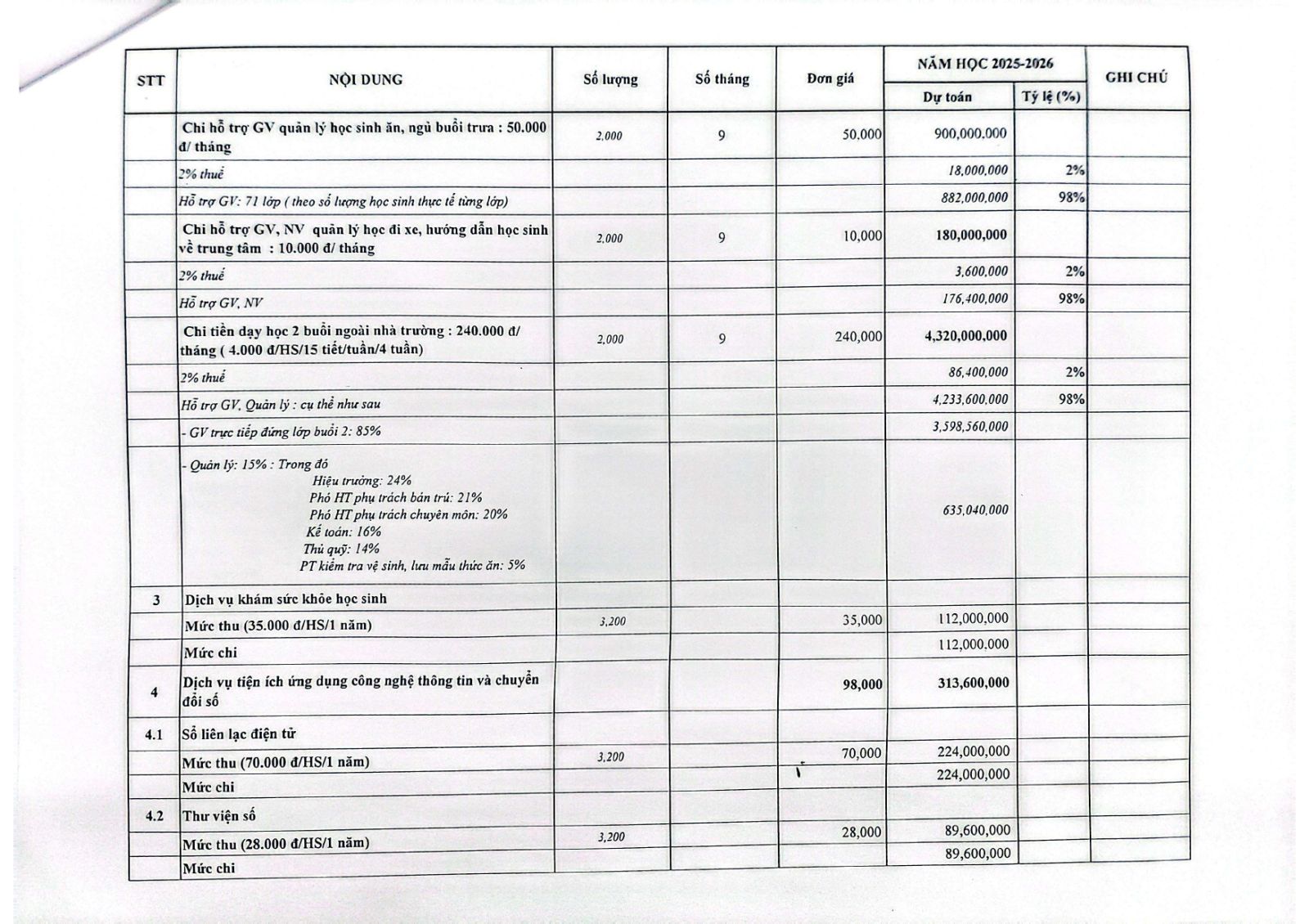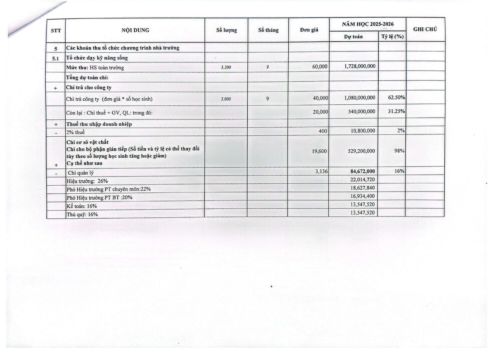 Nhà trường xin thông báo đến toàn thể cán bộ, giáo viên, nhân viên và phụ huynh học sinh về dự toán Kế hoạch dự toán thu – chi các khoản thu, mức thu, cơ chế quản lý thu chi cũng như dự toán chi tiết các nội dung thu chi trong năm học 2025-2026. Đây là căn cứ quan trọng để đảm bảo công khai, minh bạch và thuận lợi trong quá trình phối hợp giữa nhà trường và phụ huynh.