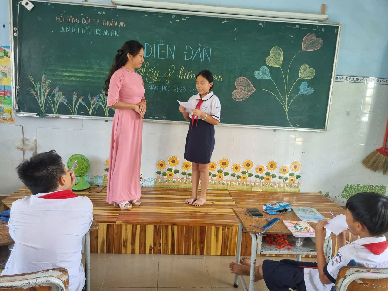 Vào ngày 15/03/2024 Liên đội trường Tiểu học An Phú đồng loạt thực hiện chương trình “ Lấy ý kiến trẻ em” trong toàn Liên đội và đại diện các chi đội khối lớp 5 làm mẫu, tổ chức tại các lớp học. Nhằm thu thập ý kiến, suy nghĩ và mong muốn của các em đội viên và học sinh cuả trường Tiểu học An Phú về các vấn đề liên quan như : học tập, sức khỏe, môi trường, tình bạn…. Thông qua chương trình này, các em có cơ hội được lắng nghe, chia sẻ và đóng góp ý kiến vào việc xây dựng vào môi trường học tập tốt hơn.