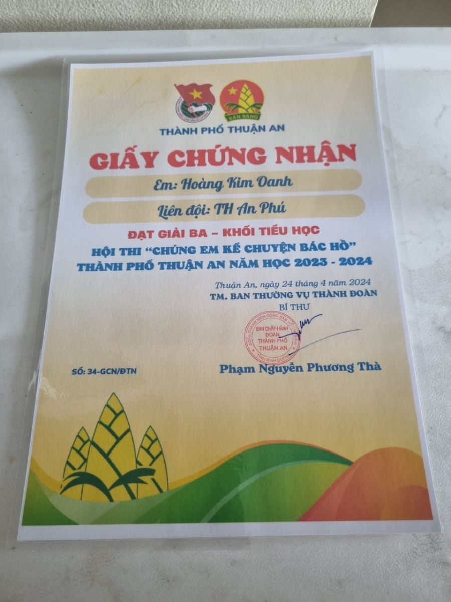 Tiểu học An Phú – giải Ba Hội thi “Chúng em kể chuyện Bác hồ 2023-2024” ngày 23/4/2024. Thực hiện chương trình công tác đội và phong trào thiếu nhi thành phố Thuận An năm học 2023-2024.