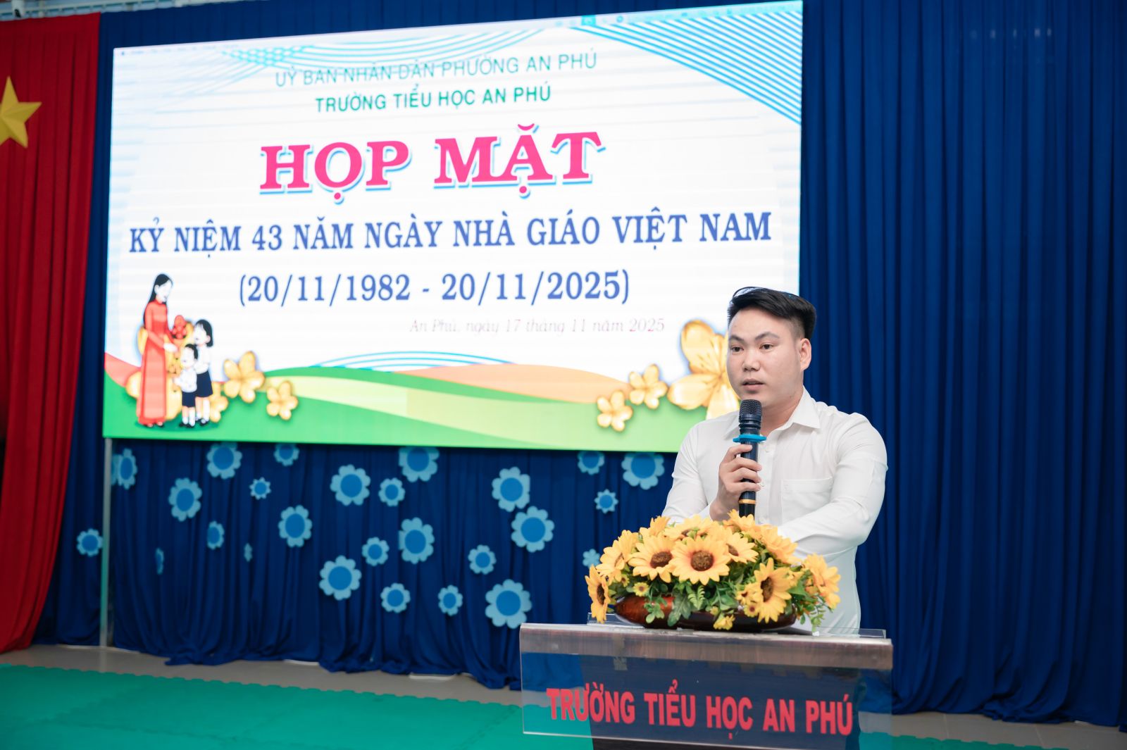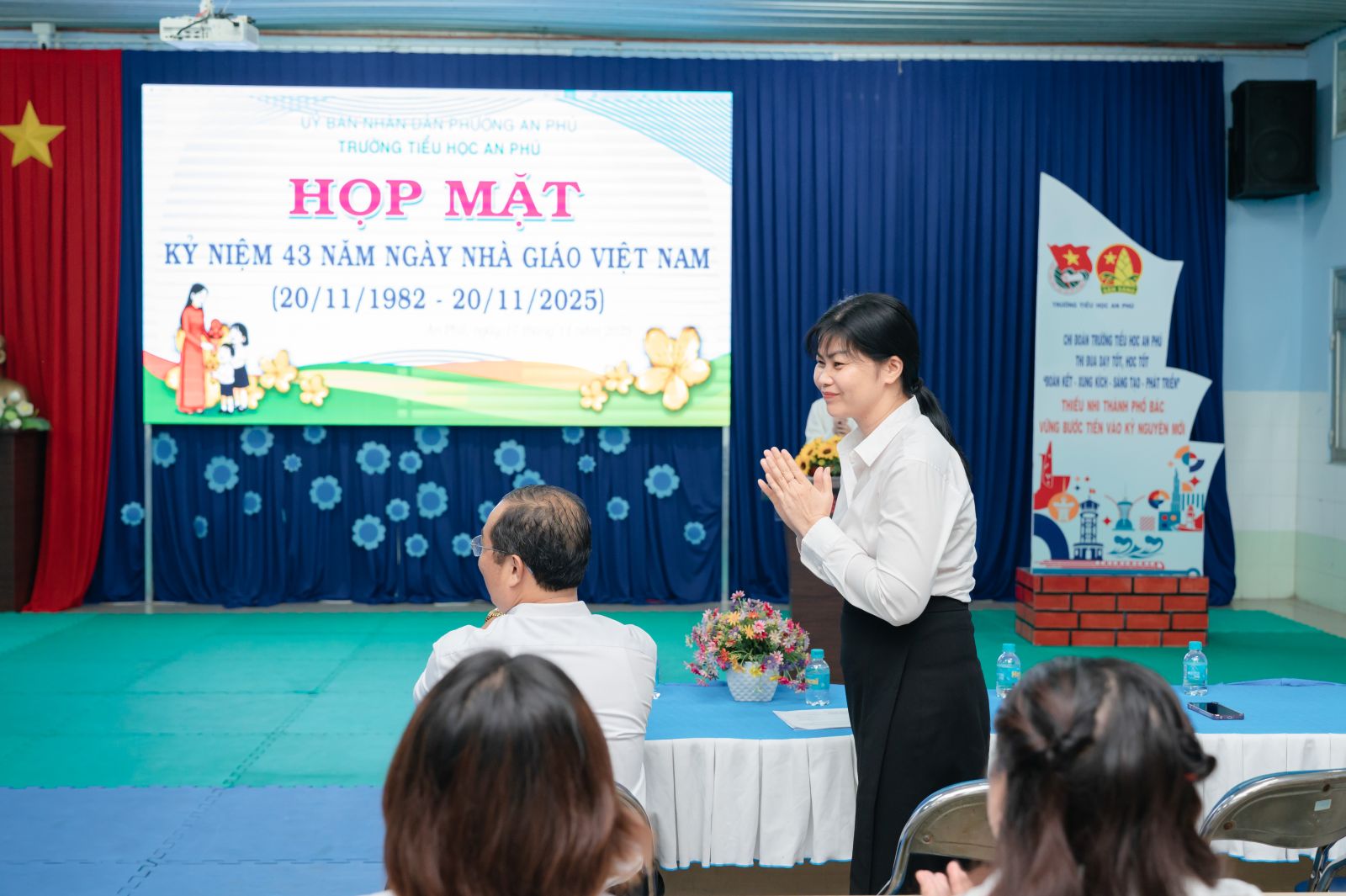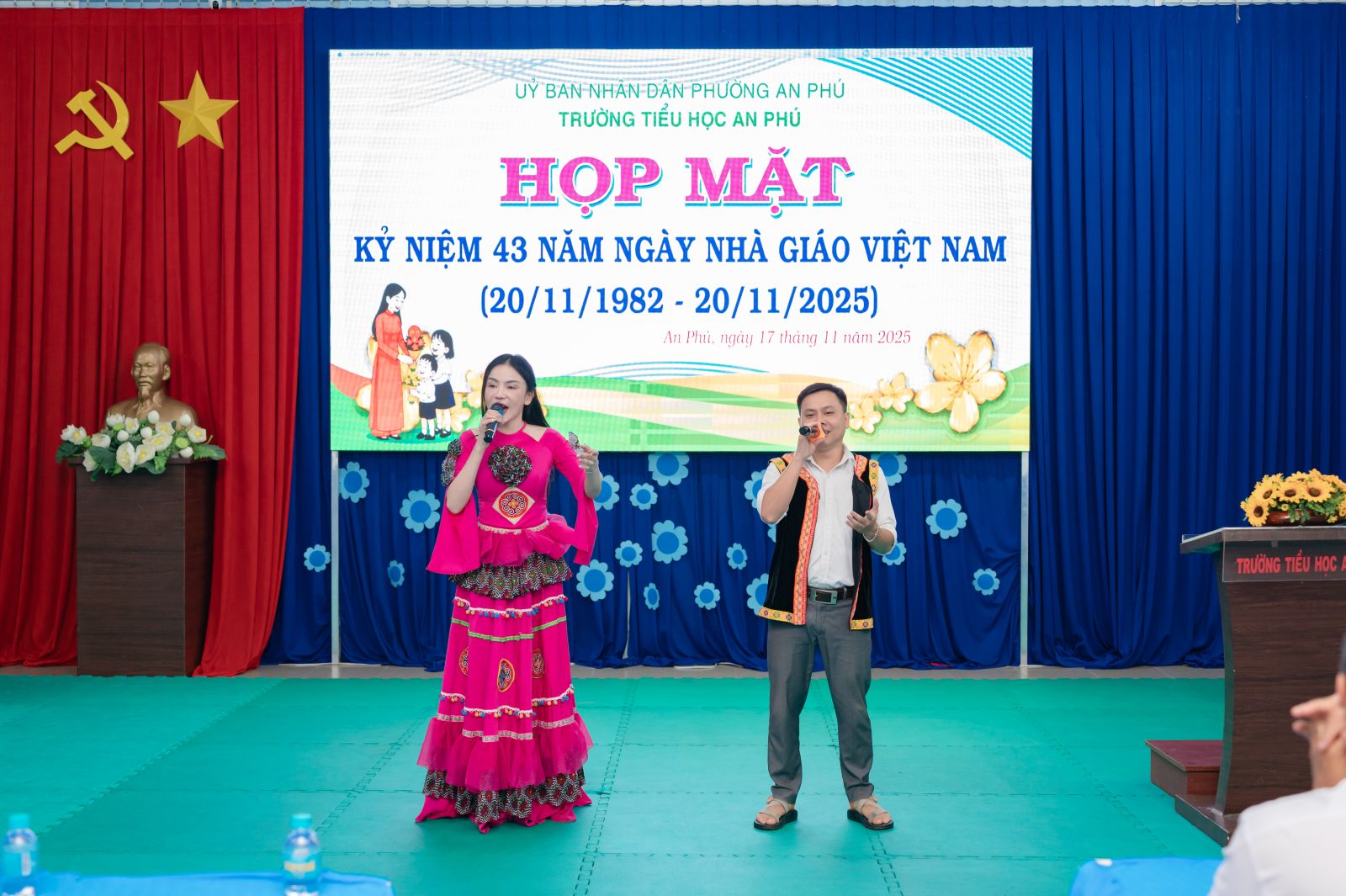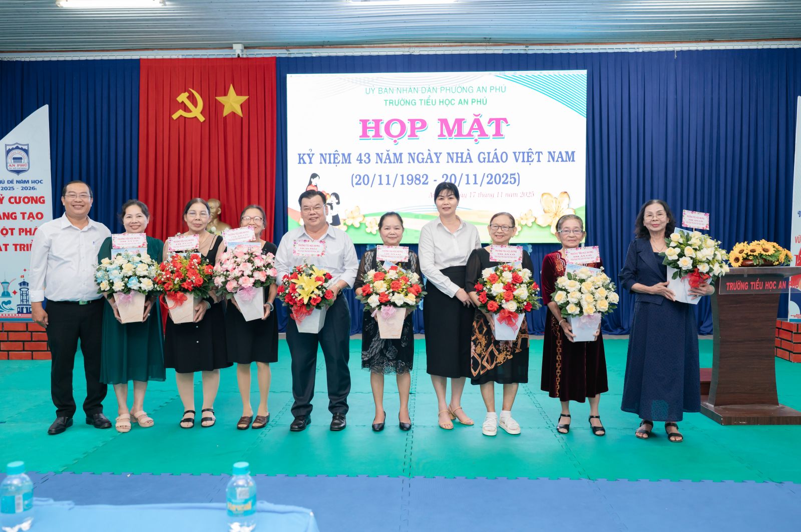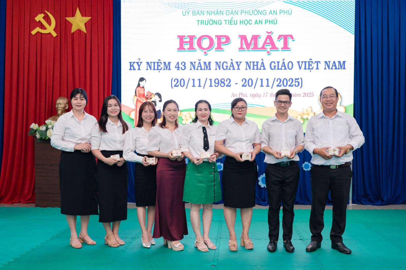 Tại buổi họp mặt, Ban Lãnh đạo nhà trường đã gửi lời tri ân chân thành và những bó hoa tươi thắm đến các thầy cô lão thành, ghi nhận những đóng góp to lớn và bền bỉ của họ cho sự nghiệp giáo dục . Đặc biệt, nhà trường đã tiến hành Trao giải Cuộc thi “Hoa Nắng Yêu Thương” (Lần IV - Mở rộng) và khen thưởng cho các tập thể, cá nhân có thành tích xuất sắc trong công tác giảng dạy và hoạt động chuyên môn . Các tiết mục văn nghệ đặc sắc từ chính các thầy cô đã mang đến không khí tươi vui, tiếp thêm động lực, khẳng định quyết tâm của tập thể sư phạm Trường Tiểu học An Phú trong việc tiếp tục nâng cao chất lượng giáo dục toàn diện.