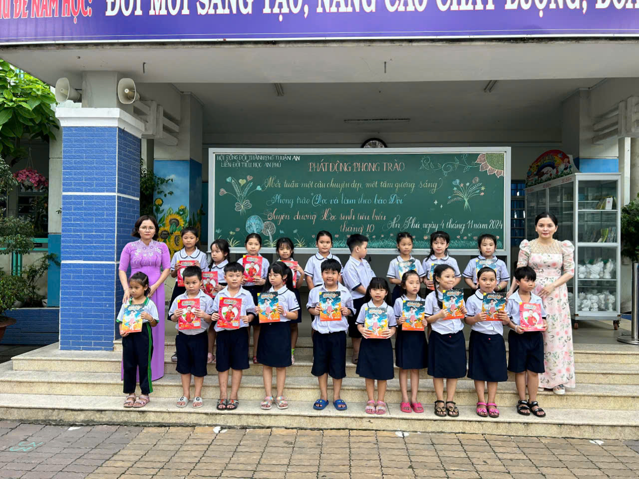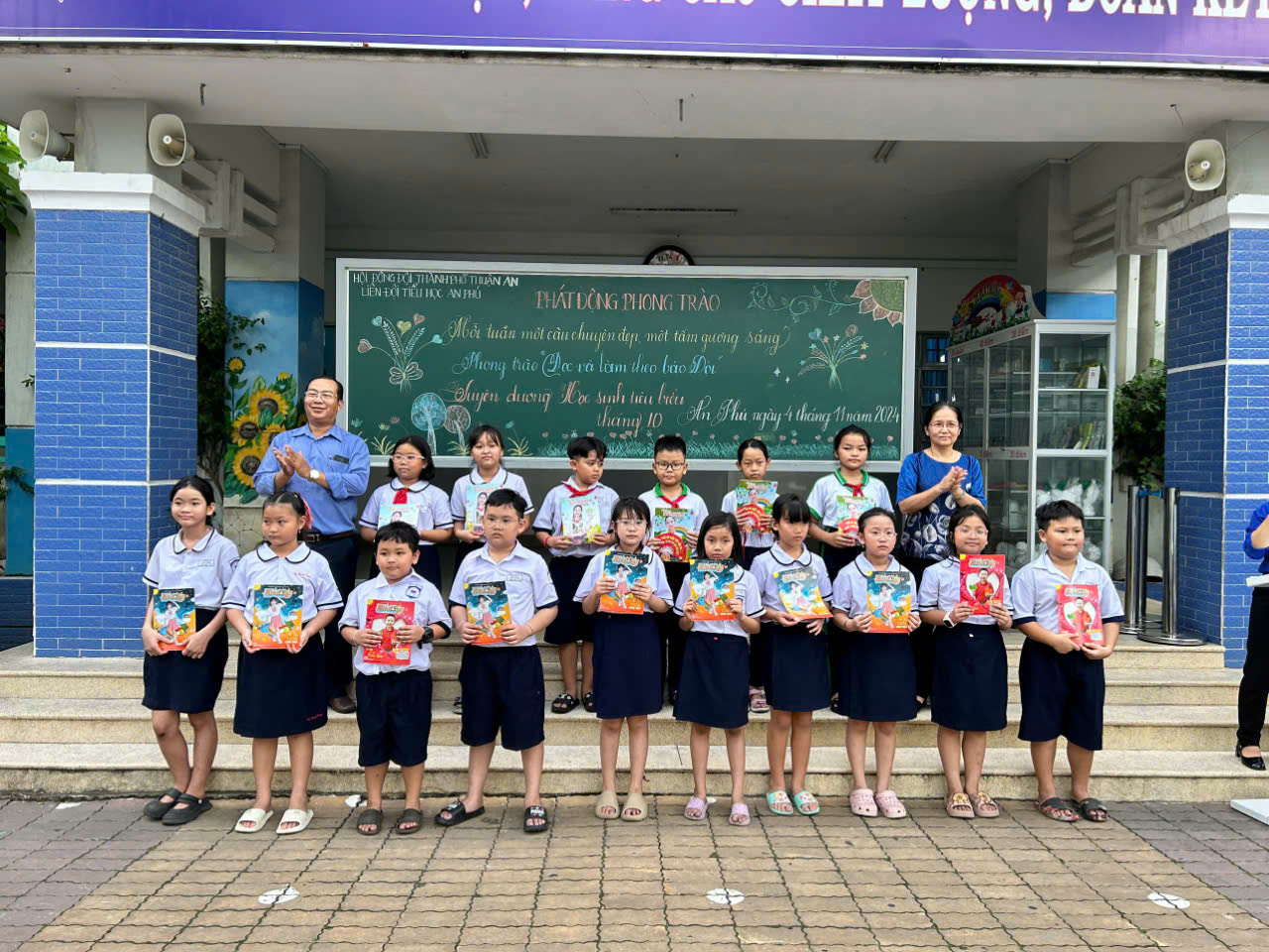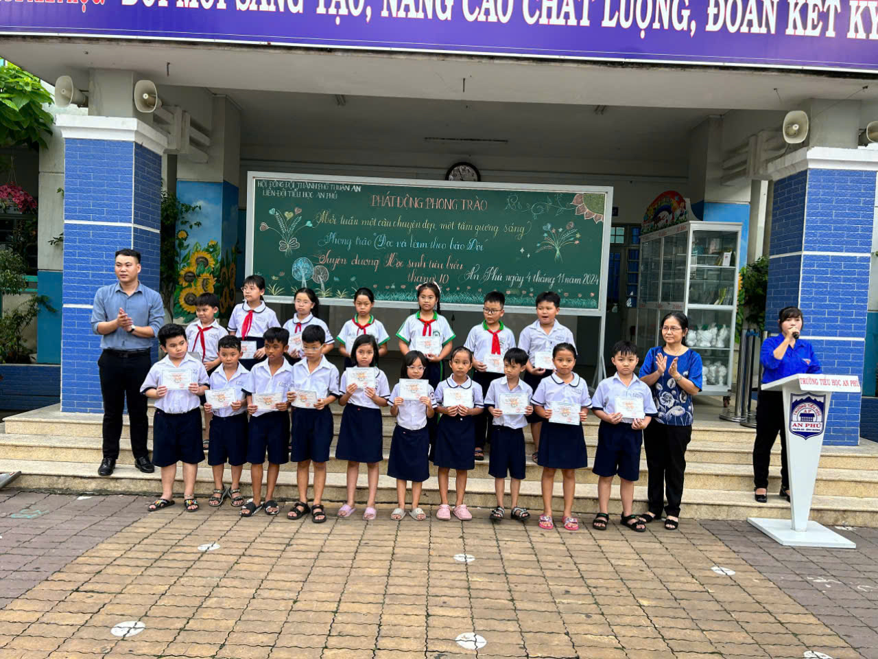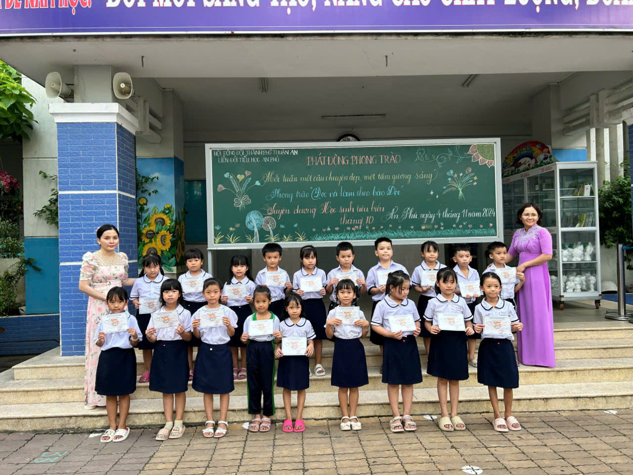 Ngày 04/11/25024 Liên đội trường Tiểu học An Phú phát động phong trào: “Mỗi tuần một câu chuyện đẹp, một tấm gương sáng, Đọc và làm theo báo Đội và Trao giấy tuyên dương cho học sinh tiêu biểu tháng 10”.